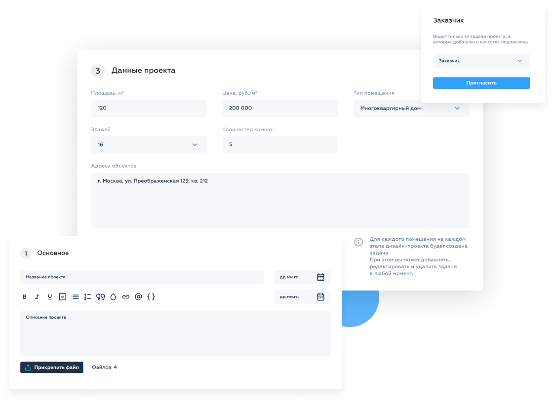 Специальный функционал для коммуникации с заказчикомВ проекте можно добавлять разделы и задачи, приглашать участников, раздавать права и согласовывать с заказчиком.